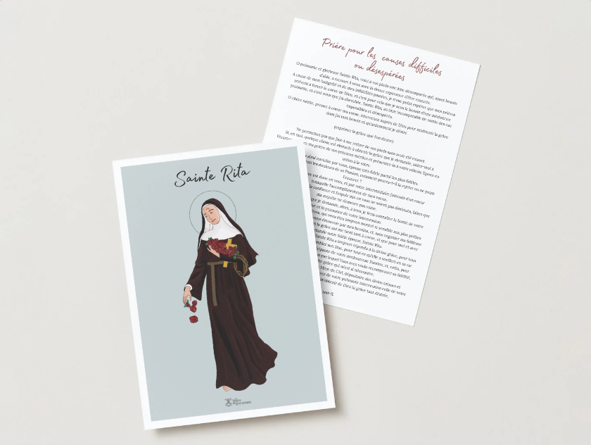 Une Jolie carte pour un évènement religieux, ou son coin prière. Cette illustration sera parfaite à encadrer ou à offrir ! Au dos, la prière à Sainte Rita pour les causes difficiles ou désespérées Format :  A6 10,5×14,8 cm Sur papier épais, impression mat supérieur Retrouvez d’autres illustrations, inspirations, et évènements sur instagram : @le_temps_des_souvenirs